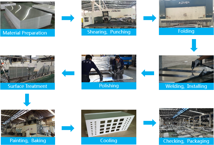 The production of aluminum alloy air-conditioning covers consists of cutting, punching, bending, rolling, welding, grinding,